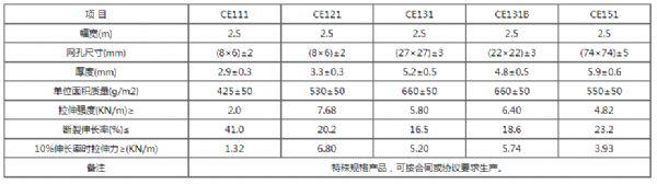 是高密度聚乙烯經(jīng)擠壓成方形、菱形、六邊形網(wǎng)格狀的產(chǎn)品,具有一定的拉伸強度和耐久性、化學穩(wěn)定性、耐候性、耐腐蝕等性能。因此可廣泛應用于巖土工程的諸多方面。該產(chǎn)品規(guī)格齊全,在此,僅介紹CE131CE151兩種用途最廣的土工網(wǎng)。